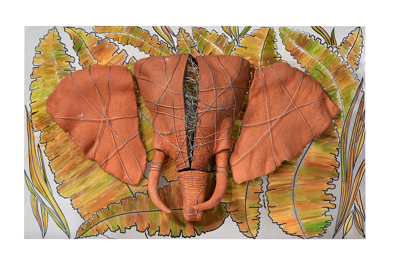 Sıcak, sonbahar tonlarında yemyeşil, stilize yaprakların oluşturduğu fon, el değmemiş doğanın güzelliğini vurguluyor ve bağlı fil formuyla dokunaklı bir kontrast oluşturuyor. Bu renk ve doku seçimi, izleyicileri çevreyle kendi bağları üzerinde düşünmeye davet ederek sıcaklık ve topraksılık hissi uyandırmayı amaçlıyor. Katmanlı, karma medya yaklaşımı, esere zengin ve dokunsal bir nitelik kazandırarak izleyicileri sanat eseriyle yakından etkileşime girmeye teşvik ediyor.