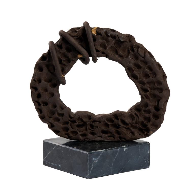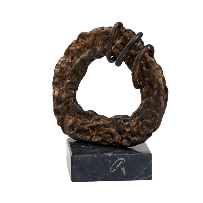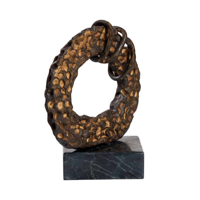 Eternal Bond is a bronze sculpture that explores the symbolism of the circle as a universal sign of unity, wholeness, and infinity. Its heavily textured surface gives it an earthy, tactile presence, while the binding rings add a sense of strength, tension, and resilience. The contrast between the raw texture and the enduring form creates a powerful dialogue between fragility and permanence.